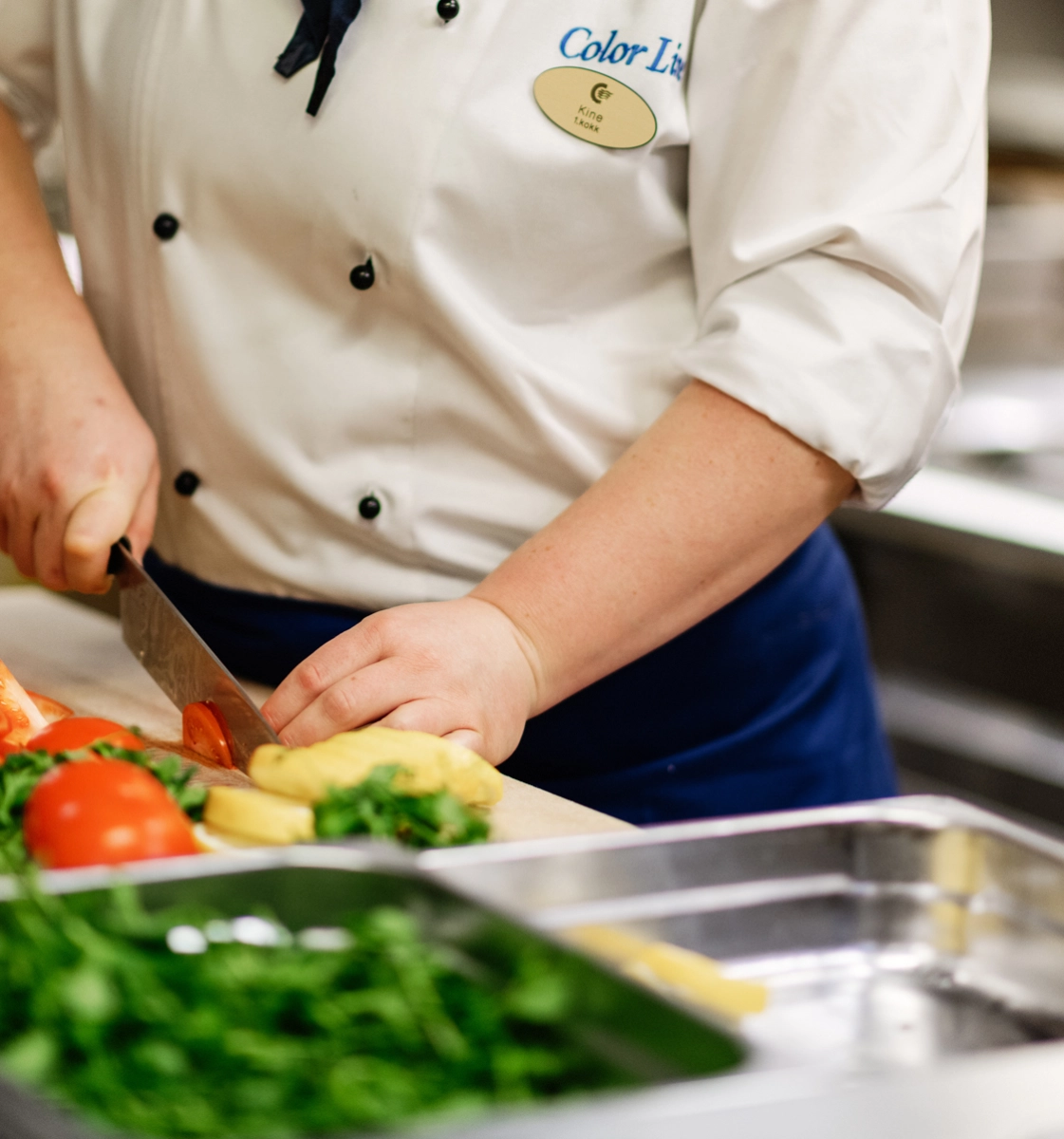 Stillingen som forpleiningsassistent på kjøkkenet byr på en variert hverdag, med arbeidsoppgaver som kutting av grønnsaker, oppvask og rydding. Lena har jobbet som forpleiningsassistent på kjøkkenet siden 2022. Les hva hun synes om å jobbe om bord.