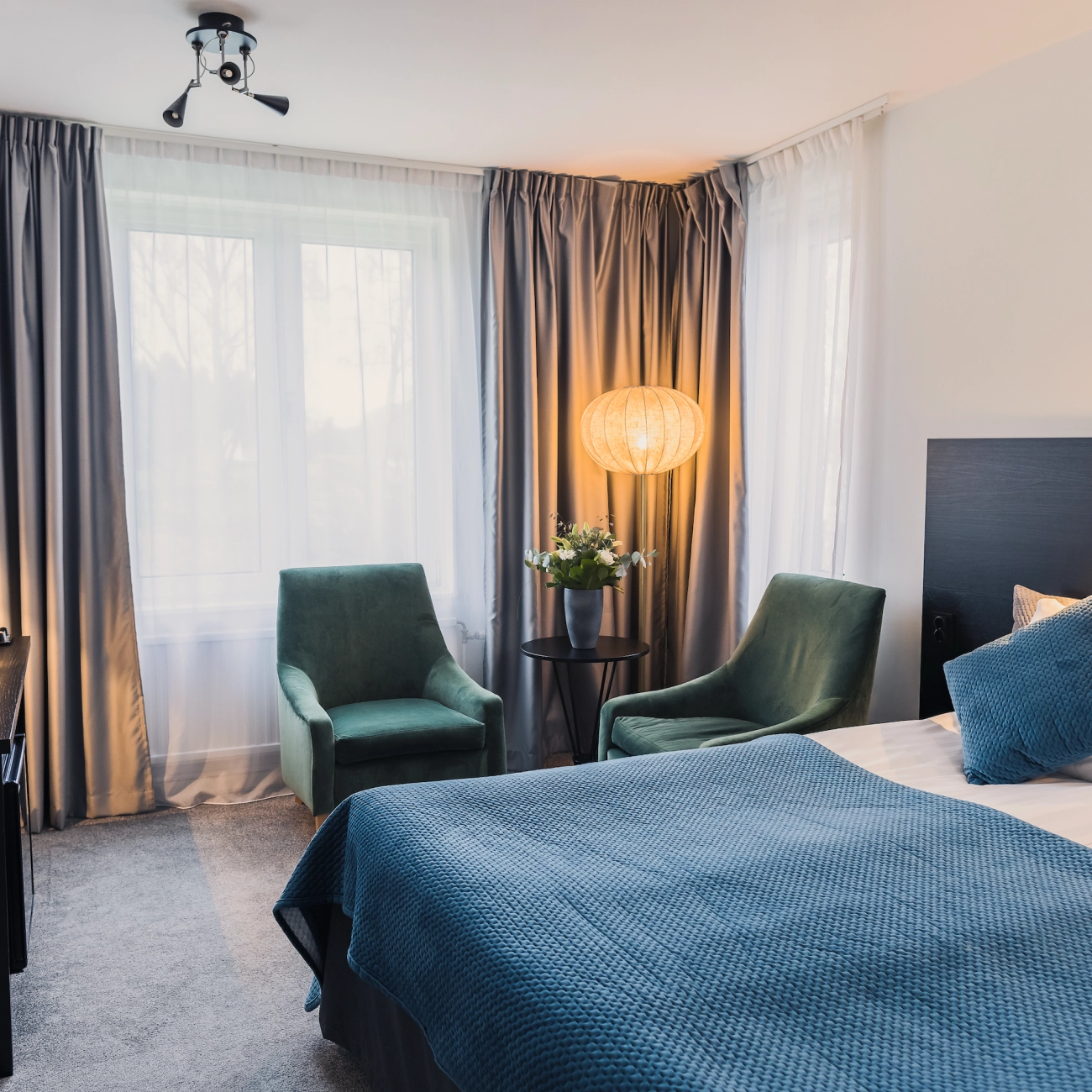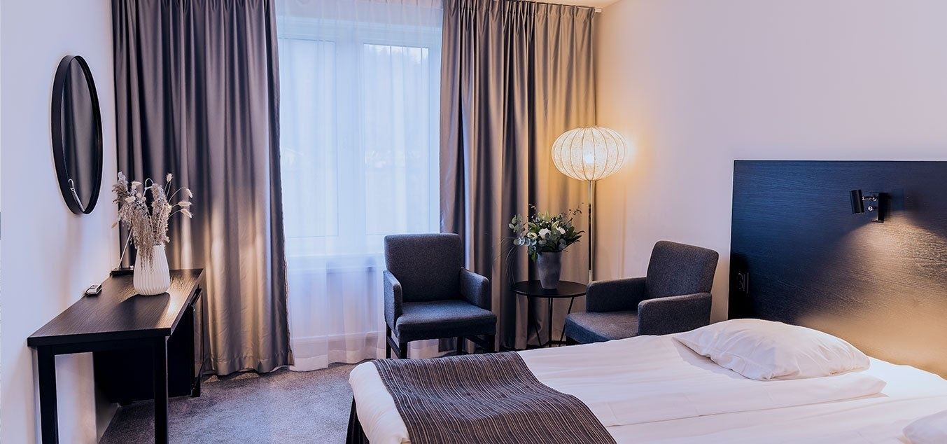 Moderne dobbeltrom på 22 m² med skandinavisk stil og komfortable Carpe Diem-senger (2 x 90 cm). Rommet har helkaklet bad med dusj/WC og 100 % veganske hårpleieprodukter fra Hjärtligt. Utsikt kan være mot grøntområde, innergård eller parkering, og det er mulig med ekstra seng ved behov.