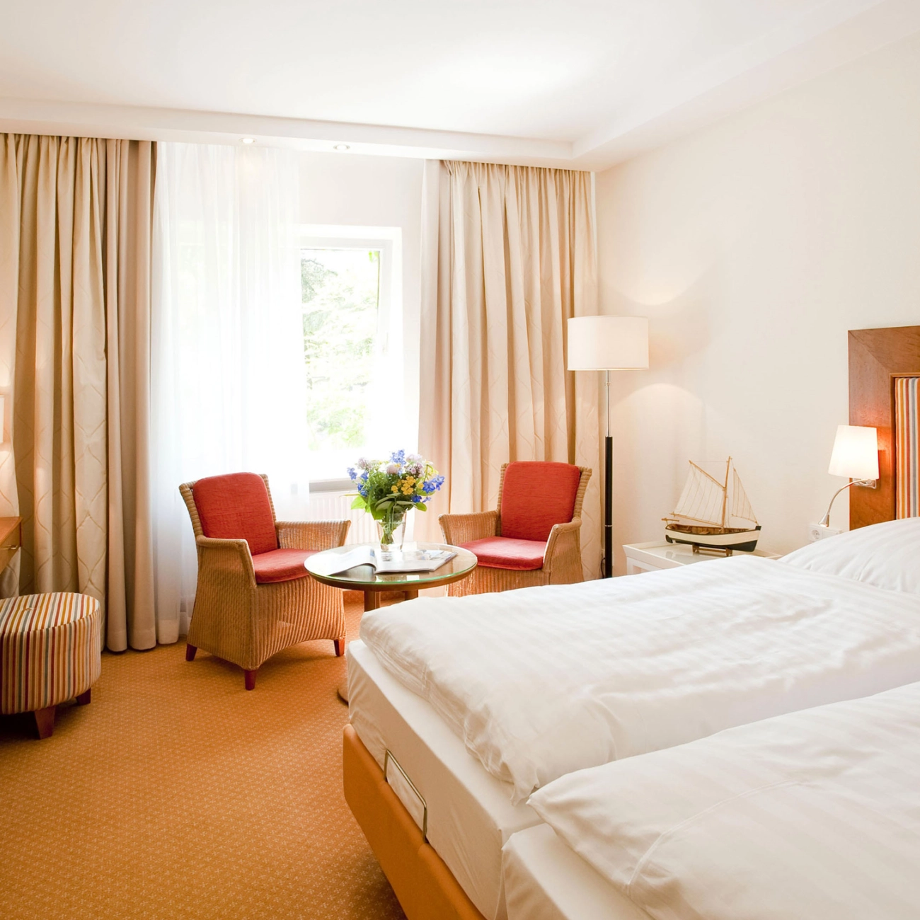 Romslige dobbeltrom innredet i klassisk nordtysk stil med komfortable senger og alle fasiliteter.