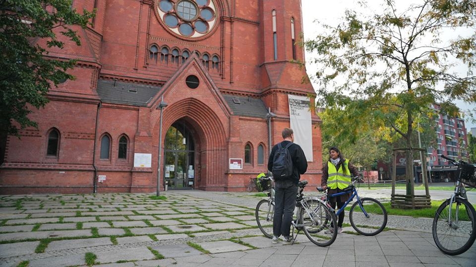 I Berlin ble vi med Green Bike Tours Berlin på en rundtur i byen. Turen viser turister Berlins mange bærekraftsinitiativer. Første stopp var ved Heilig-Kreuz-Kirch.